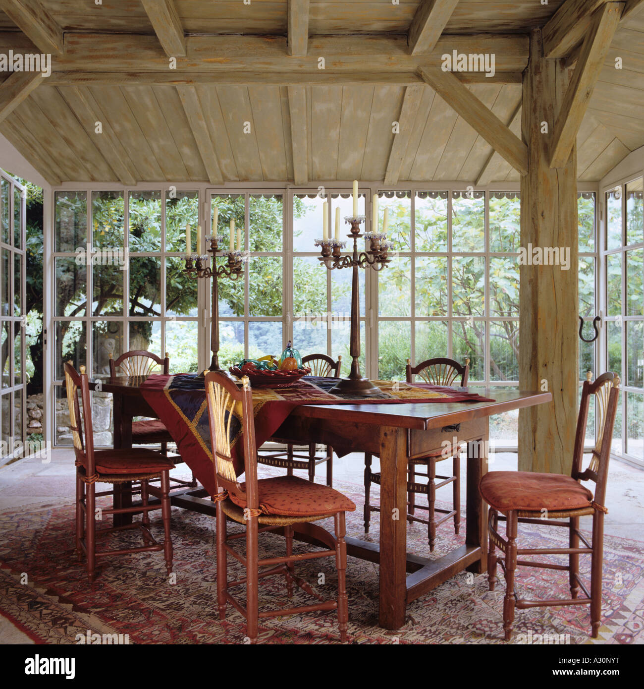 Table And Chairs On Patterned Carpet In Wooden Barn Like