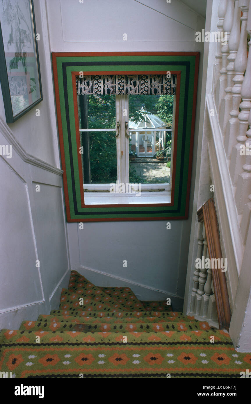 Stairs With Red And Green Patterned Carpet And View Of